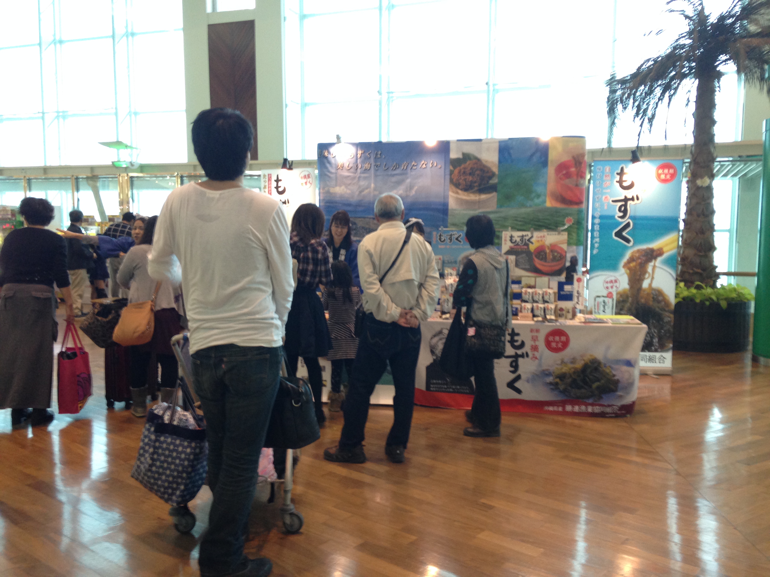 美味しい早摘みもずくを県内だけでなく、県外の方にも楽しんでいただきたくて、那覇空港で行うことになりました。過去にも空港でイベントをさせていただきましたが、試食された皆さんの笑顔がとても印象的でした。