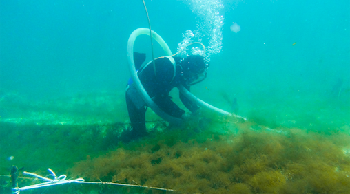 海の中では、掃除機のようなホースで網に生えているモズクを吸い取って収穫していきます。