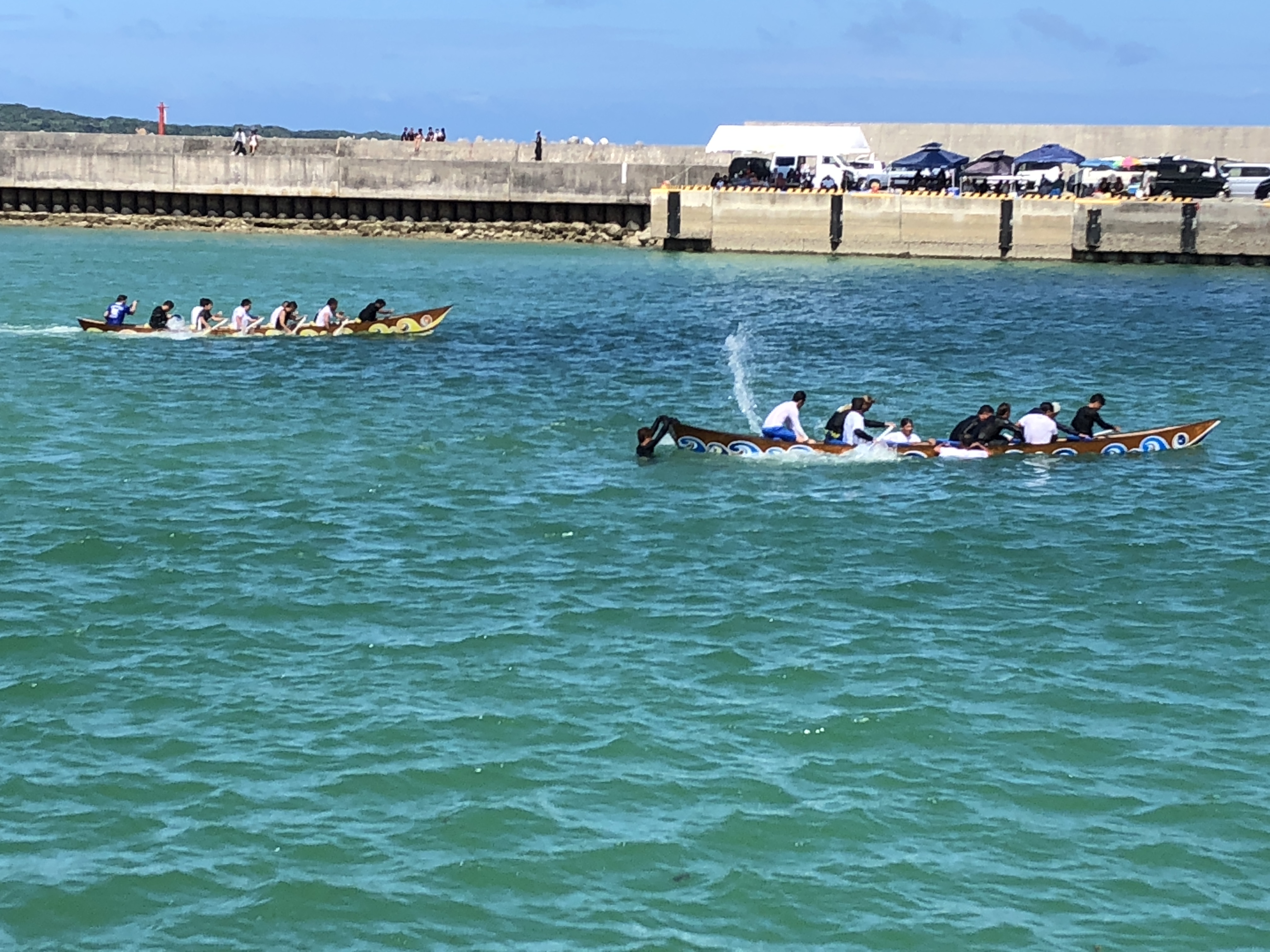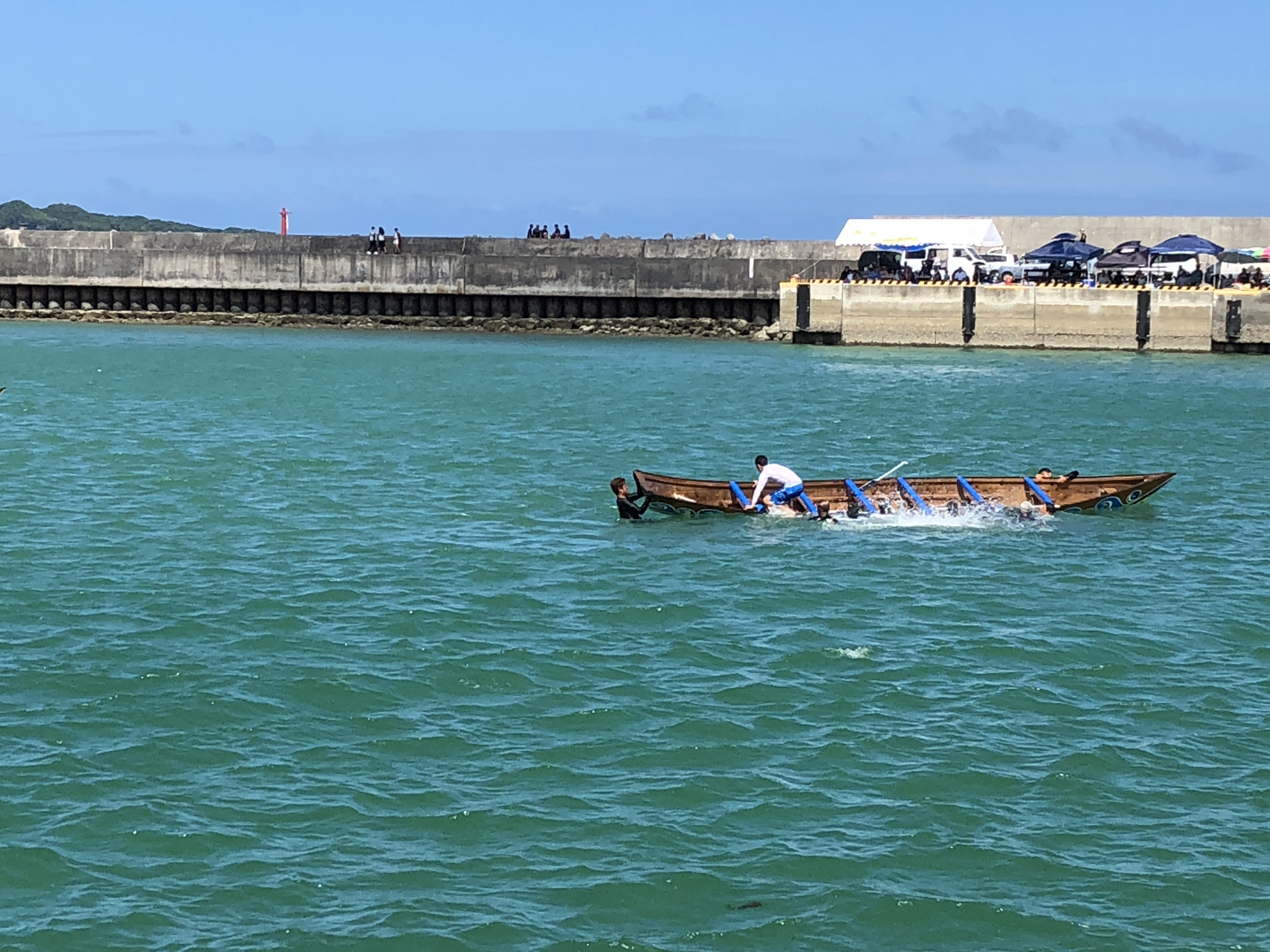 ハーリーのレースの途中、決められた場所で転覆して全員海に落ちて、