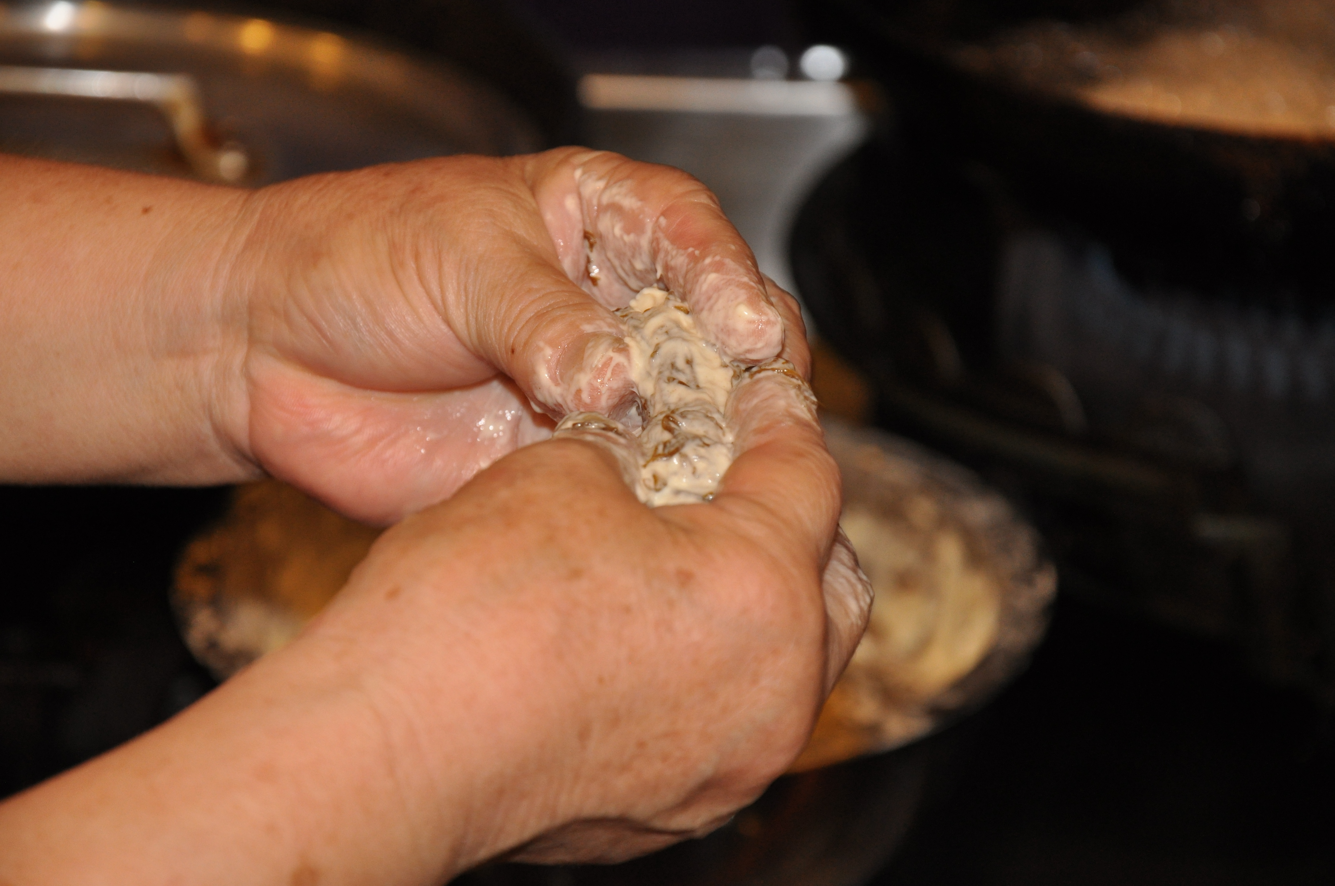女将さんの手もとのもずくのタネは、