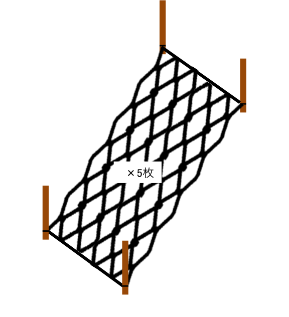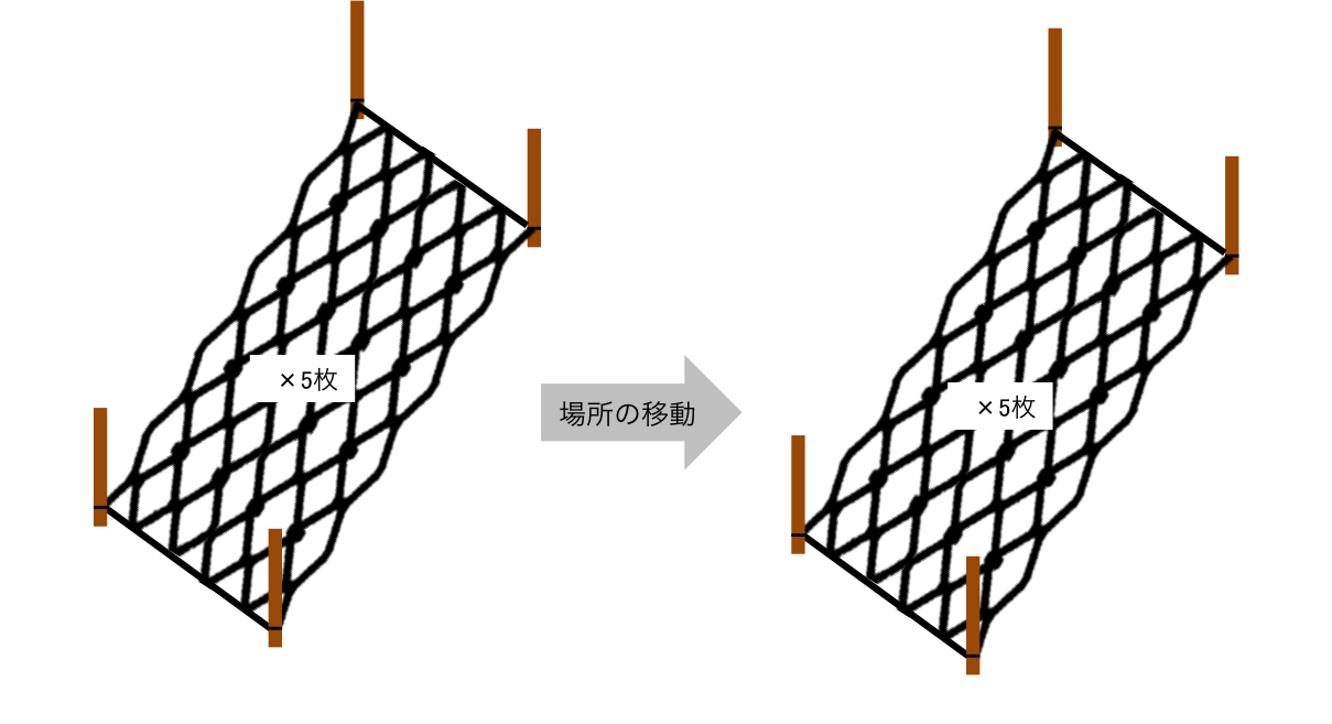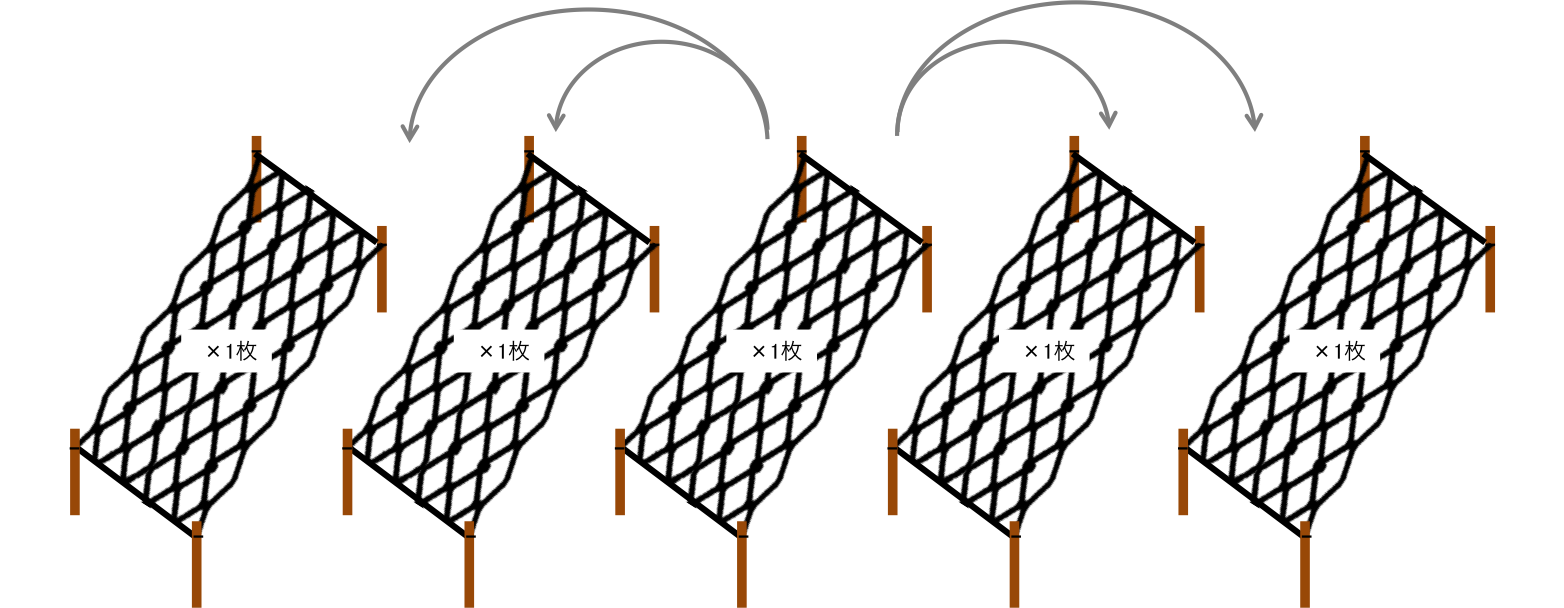 網は苗床と同様に、5枚1組のままで海底に着地させるように張っていきます。
