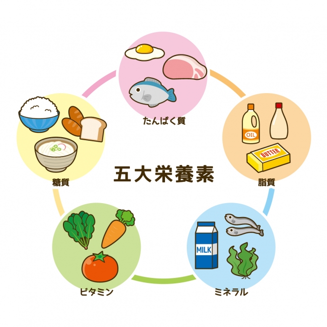 基本となる栄養素には、糖質(炭水化物)、脂質、たんぱく質、ビタミン、ミネラルがあります。