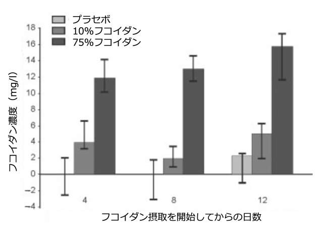 下のグラフは、フコイダンを摂取して4、8、12日目のフコイダン濃度を調べたものです。