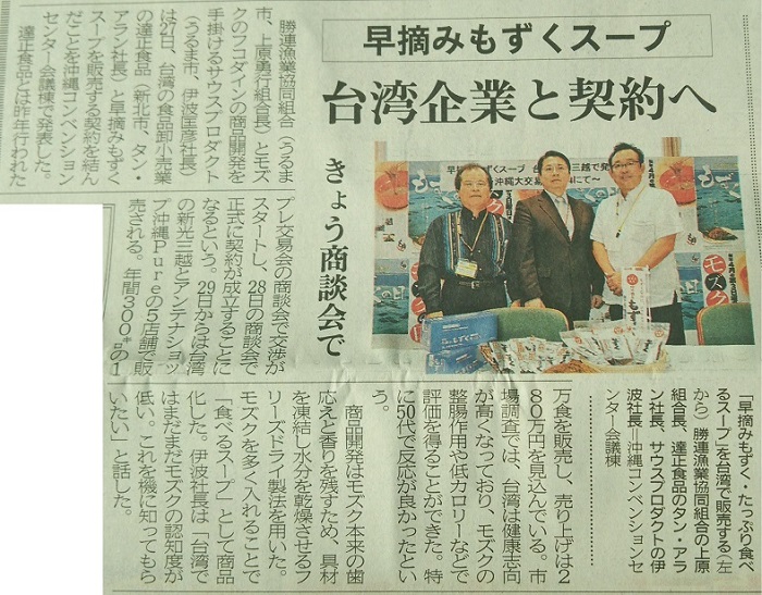 沖縄タイムスに掲載されました。【沖縄大交易会:もずくスープ、台湾企業と契約へ】