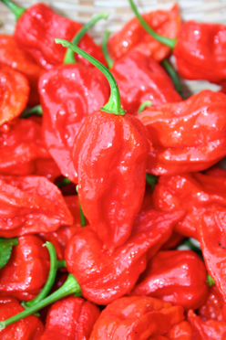 アカハチ唐辛子は独特のフルーティーな風味にキレの良い猛烈な辛味があります。そのスコビル値(辛さの指標)はハバネロの約5倍になります。